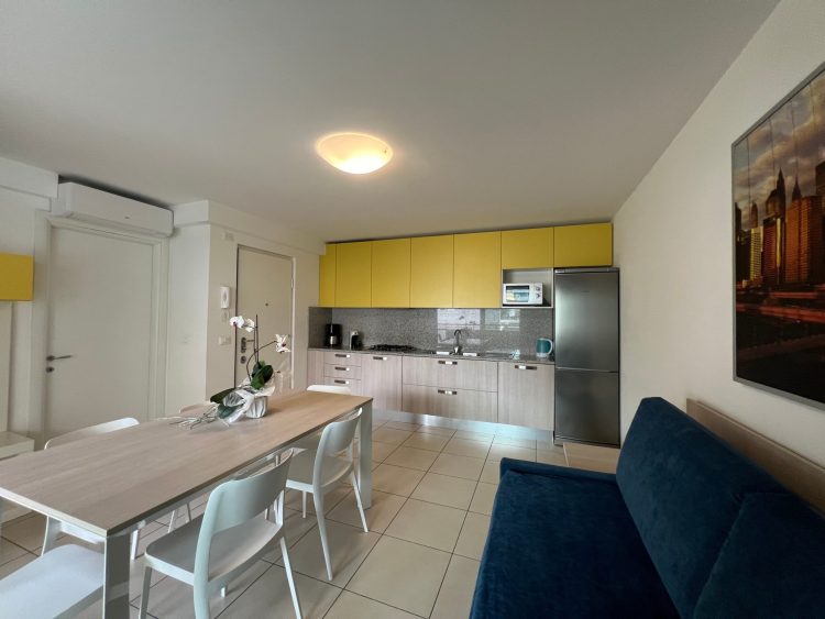 Exclusive residential biocompatible building located in the city centre of Lignano Sabbiadoro, only 50 Mt. far from the beach. The apartments, made with the use of renewable sources, are furnished with new and modern furniture, and are equipped with more comforts such as: security door, SAT-TV, air conditioning and heating, safe, microwave oven, washing-machine and dishwasher, hairdryer, filter coffee machine, espresso coffee machine Lavazza A Modo Mio®, kettle and big fridge. Lift. Each apartment has 1 numbered parking place at about 100 Mt. 1 “Light WI-FI free” access included per apartment (for 3 devices at a time. No streaming no download).